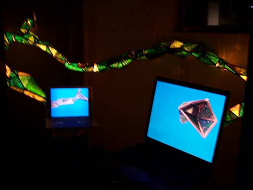 Het betreft een installatie met 2 computerschermen, videoprojectie, sculptuur uit gerecycleerde printplaten in lood gezet (glas in lood techniek), licht en geluid.